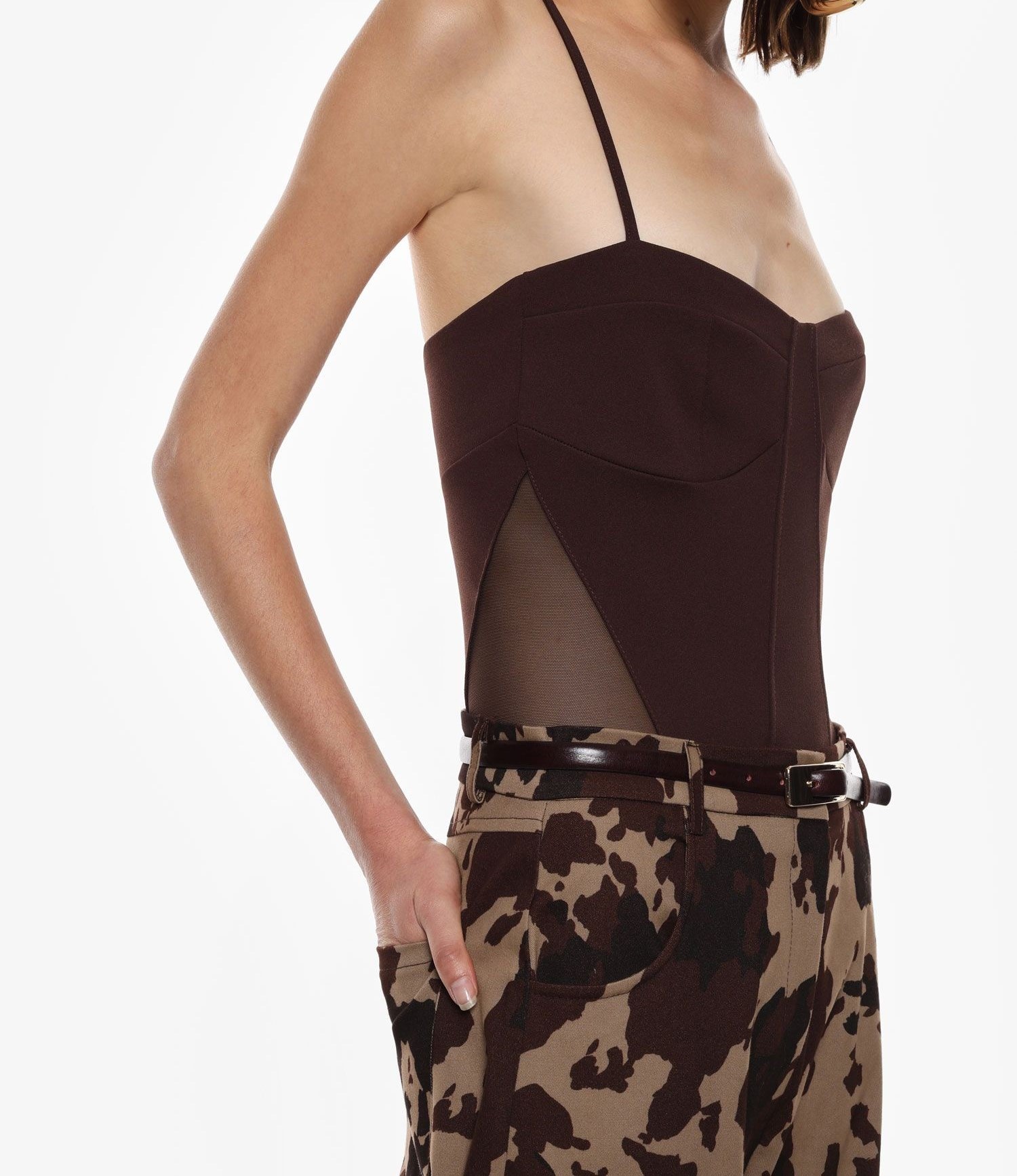 Questo body con spalline sottili si distingue per la silhouette aderente e i pannelli laterali in rete trasparente che valorizzano il design. La scollatura dritta rende il capo ideale da indossare sotto blazer o abbinato a pantaloni a vita alta, offrendo infinite possibilità di stile e interpretazione per un guardaroba contemporaneo.