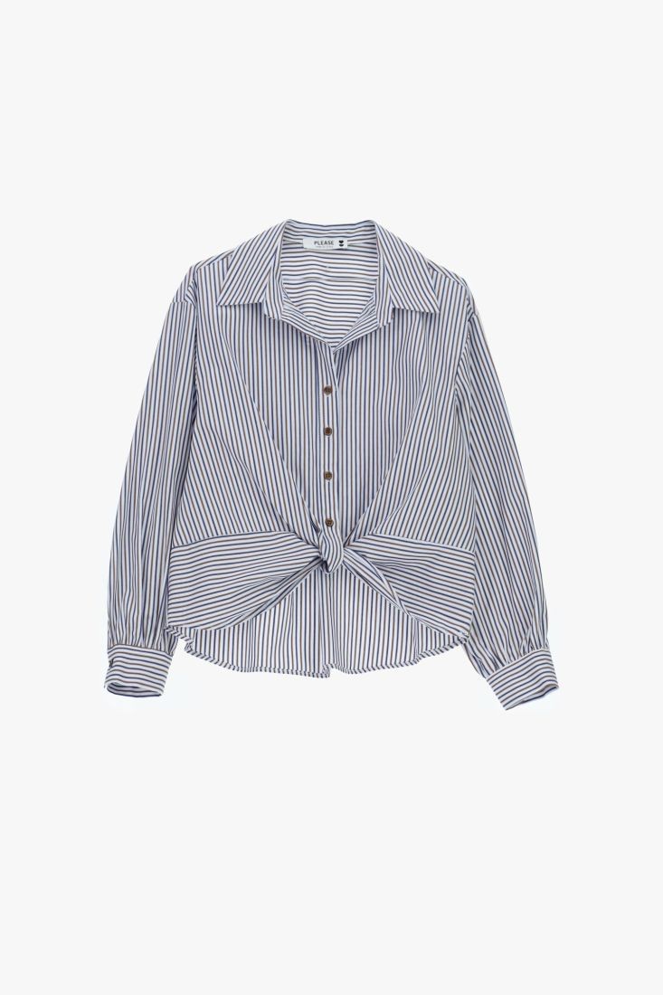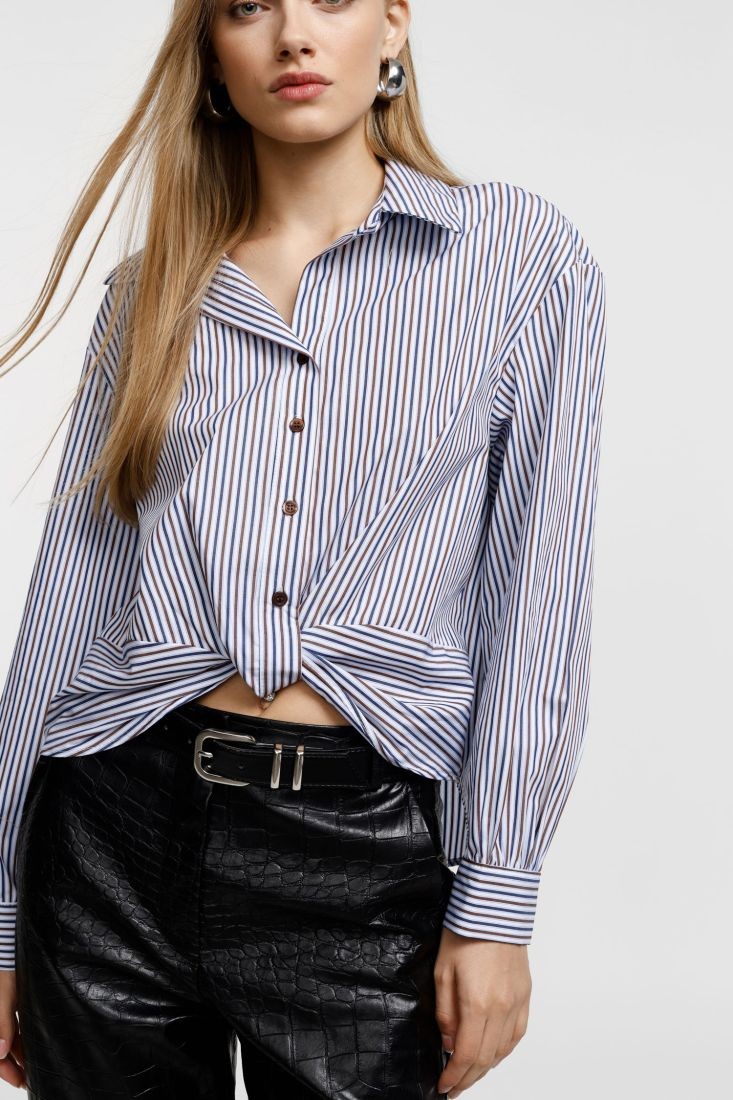 Una camicia dal taglio relaxed, arricchita da un vivace motivo a righe e un dettaglio annodato sul davanti che la rende subito distintiva. Maniche lunghe e collo classico la rendono perfetta per tutte le stagioni. Ideale con jeans o pantaloni a vita alta, dona energia ai look quotidiani e si presta a mix e abbinamenti sempre nuovi.