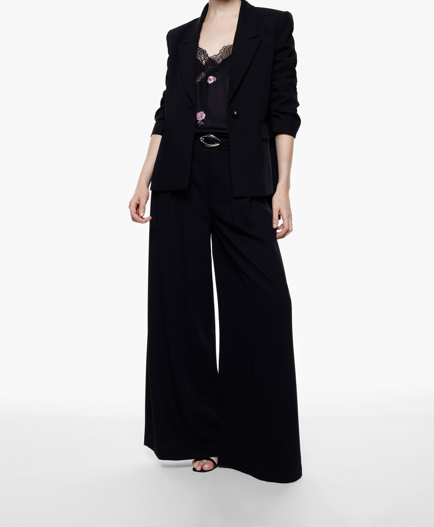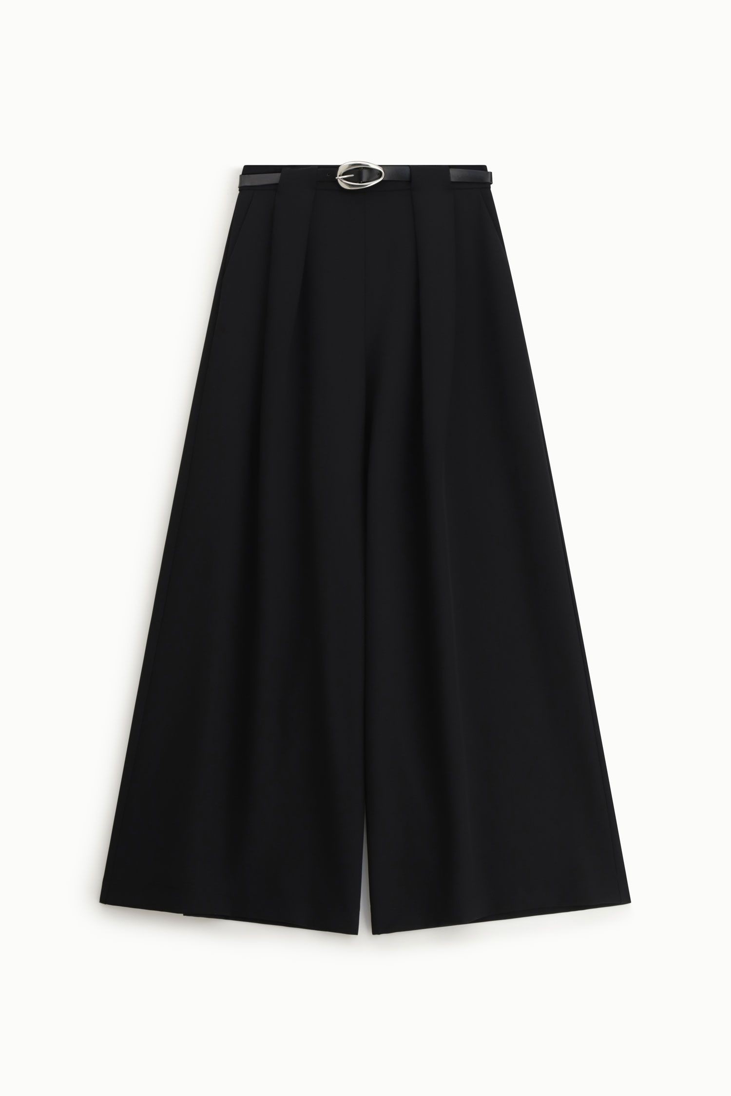 Pantaloni palazzo caratterizzati da una linea ampia e fluida, impreziositi da pinces frontali e cintura coordinata con fibbia metallica. La vita alta valorizza la figura, mentre la lunghezza completa crea un effetto allungante, ideale per comporre outfit sofisticati e dallo stile attuale.