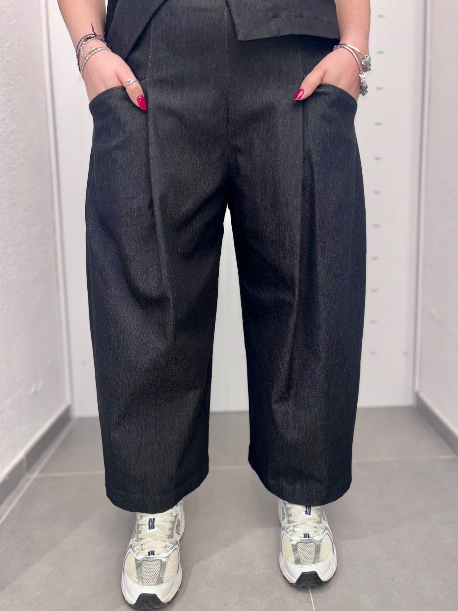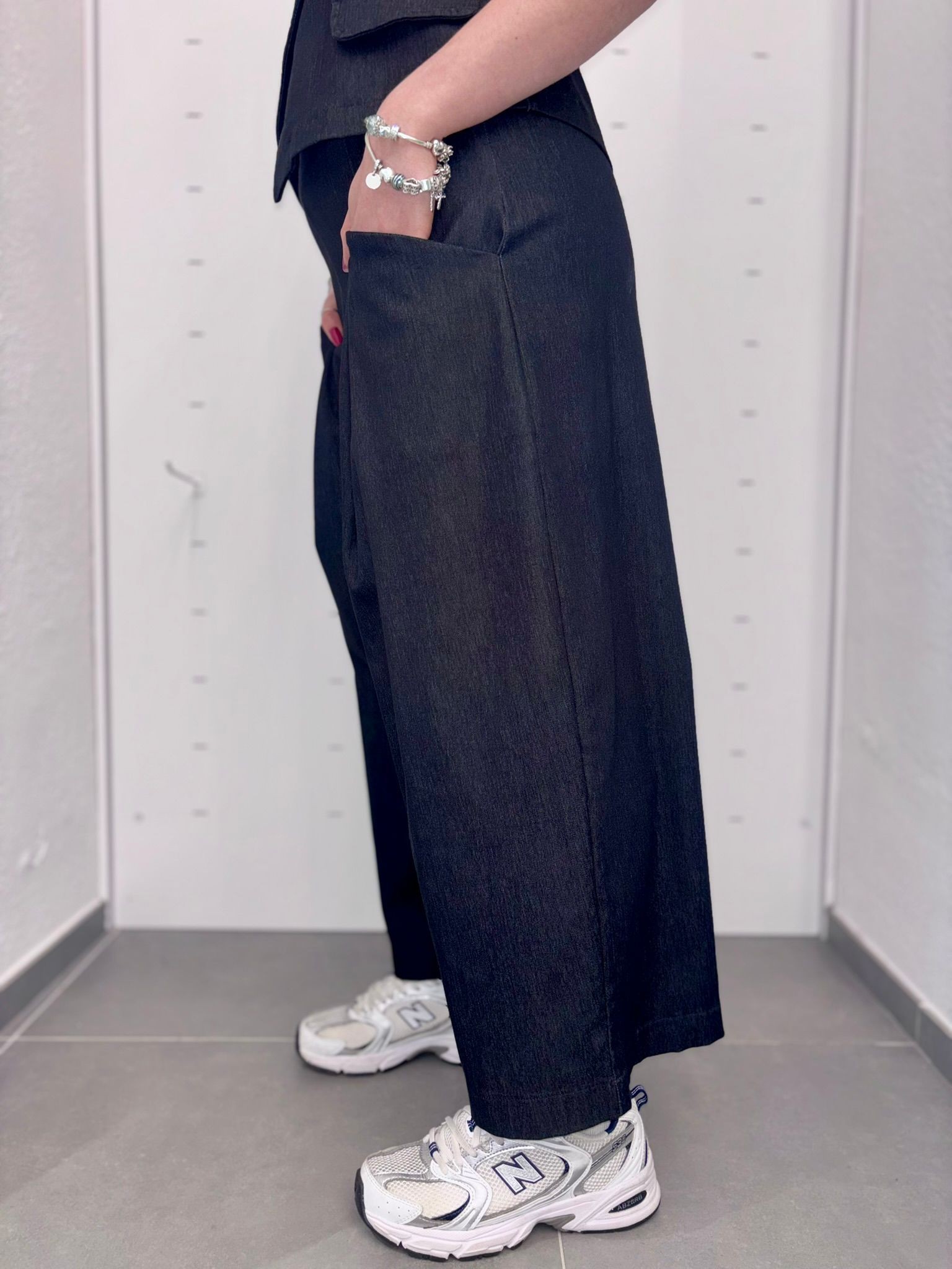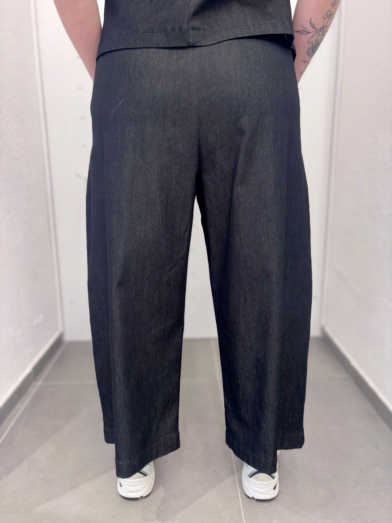 Pantalone over cropped in cotone effetto denim elasticizzato